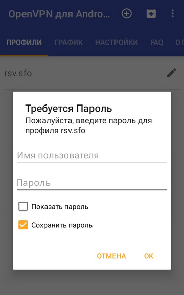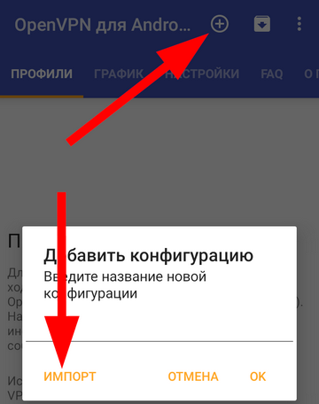 3. Запустите установленное приложение «OpenVPN for Android» и нажмите кнопку добавления профиля («+»). Затем, нажмите кнопку «Импорт».