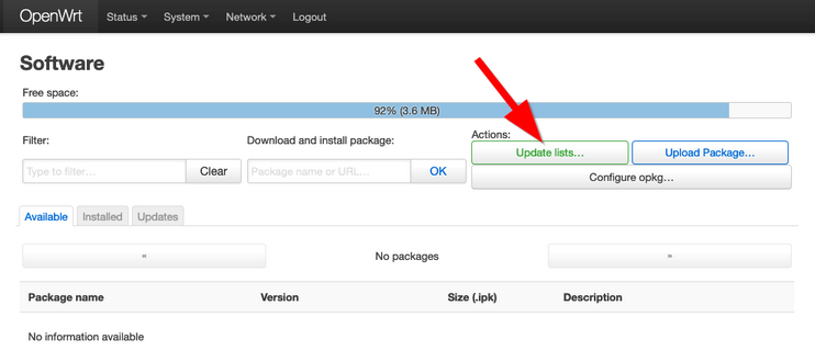 2. Откройте веб-интерфейс роутера, затем меню «System» -> «Software». Нажмите «Update lists» и дождитесь обновления списка пакетов.