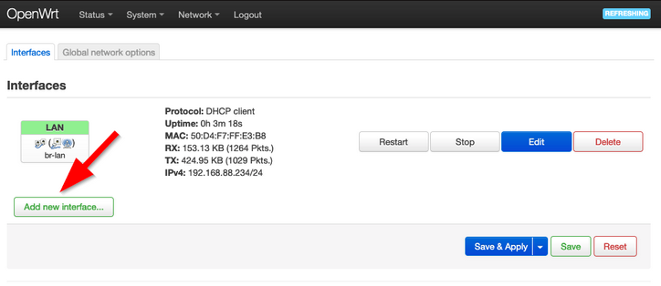 5. Откройте меню «Network» -> «Interfaces». Нажмите кнопку «Add new interface».