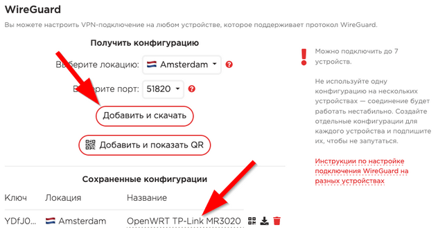 Затем выберите локацию и порт, по которым вы хотите подключиться, и нажмите «Добавить и скачать» и сохраните полученный файл.
