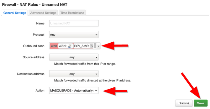Откройте меню «Network» -> «Firewall», вкладка NAT Rules.Нажмите Add и выберите в «Outbound zone» - «WAN», а в «Action» - «MASQUERADE», затем нажмите «Save» и «Save & Apply» и снова перезагрузите роутер.