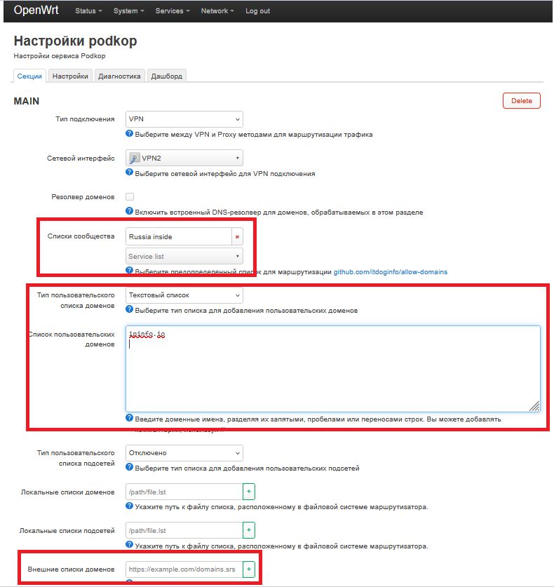 Podkop - это утилита для OpenWrt, предоставляющая удобный веб-интерфейс для управления VPN по различным протоколам, в том числе AmneziaWG 2 и VLESS.