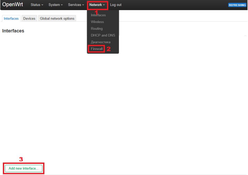 5. Откройте веб-интерфейс роутера в браузере: http://192.168.1.1 (или укажите другой IP роутера) и перейдите: Network → Interfaces → Add new interface: